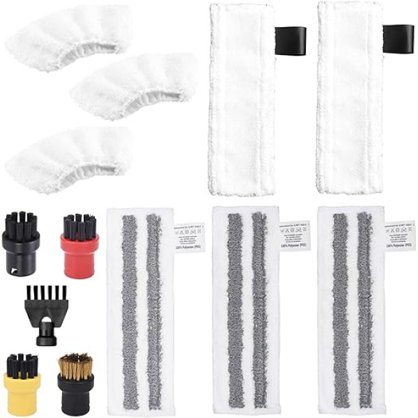 Accessories for Kärcher steam cleaners: the set contains 3 floor cloths, 2 sanding cloths, 3 hand nozzles, 1 black grout bristles and 4 cleaning brushes, compatible with Kärcher Easyfix SC1 SC2 SC3 SC4 SC5 steam cleaners and other models. With 1 grout bristle: black grout bristles are perfect for cleaning tile joints. Thanks to the perfectly matched fit of the bristles, the bristles nestle into the joints with full steam and ensure bare tile joints in no time at all. Cleaning brushes: Our high-quality nylon and brass brushes effortlessly remove dust, dirt and crusts from hard surfaces such as ceramics and metal appliances. Different colours can be cleaned in different places to avoid cross contamination. High-quality materials: the cloths are made of absorbent microfibres that effectively absorb dirt and protect the floor surface from scratches. Attached with Velcro, our wipes & covers are easy to install and remove to keep your steam cleaner in top condition. Effective cleaning: the wipes replacement parts for Karcher window cleaner effortlessly and quickly deep in kitchens, bathrooms and hard-to-reach corners and dirty surfaces. Suitable for cleaning hard floors such as wood, ceramic, laminate, marble and short wool carpets. › See more product details; Product description Features: - Our microfibre cloths and covers protect your floors from scratches and remove dirt and hard stains from floor surfaces. - Suitable for cleaning kitchen, bathroom, wax wood floors, PVC floors, tile floors, etc. - The replacement cloths last 6-12 months and should be replaced regularly to ensure the best performance of the steam cleaner. - Compatible with Karcher Easyfix SC1 SC2 SC3 SC4 SC5 steam cleaner. Package includes: - 3 x microfibre floor cloths. - 2 x sanding cloths. - 3 x hand nozzle microfibre cloth. - 4 x round cleaning brushes. - 1 x black grout bristles. Customer Service: - We offer you not only high-quality products, but also excellent customer service. If you have any questions or problems, please feel free to contact us; Product description Features: - Our microfibre cloths and covers protect your floors from scratches and remove dirt and hard stains from floor surfaces. - Suitable for cleaning kitchen, bathroom, wax wood floors, PVC floors, tile floors, etc. - The replacement cloths last 6-12 months and should be replaced regularly to ensure the best performance of the steam cleaner. - Compatible with Karcher Easyfix SC1 SC2 SC3 SC4 SC5 steam cleaner. Package includes: - 3 x microfibre floor cloths. - 2 x sanding cloths. - 3 x hand nozzle microfibre cloth. - 4 x round cleaning brushes. - 1 x black grout bristles. Customer Service: - We offer you not only high-quality products, but also excellent customer service. If you have any questions or problems, please feel free to contact us; Features: - Our microfibre cloths and covers protect your floors from scratches and remove dirt and hard stains from floor surfaces. - Suitable for cleaning kitchen, bathroom, wax wood floors, PVC floors, tile floors, etc. - The replacement cloths last 6-12 months and should be replaced regularly to ensure the best performance of the steam cleaner. - Compatible with Karcher Easyfix SC1 SC2 SC3 SC4 SC5 steam cleaner. Package includes: - 3 x microfibre floor cloths. - 2 x sanding cloths. - 3 x hand nozzle microfibre cloth. - 4 x round cleaning brushes. - 1 x black grout bristles. Customer Service: - We offer you not only high-quality products, but also excellent customer service. If you have any questions or problems, please feel free to contact us
