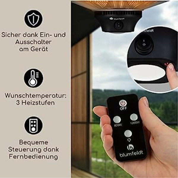 Gentle heat: Heat should be in all six corners: The blumfeldt Heat Hexa Infrared Heater brings gentle warmth to your balcony and patio for cosiness outdoors, even on cool days and nights Simple: When the temperatures fall, simply switch on the ceiling heater with a press of a button, select the desired heat setting and breathe new life into every party. The infrared ceiling heater will be sure to reliably provide you with heat at all times Output: The heater is easily hung on the ceiling with a 50 cm long chain and thus provides you and your guests with up to 2000 W heating power quickly and efficiently. The IR ComfortHeat system delivers heat very quickly Heat Levels: Enjoy, cosy warmth from the first second! With a gentle touch of the integrated touch panel, you can choose between the three heat settings - 800, 1200 or 2000 watts in seconds and thus easily respond to the needs of your guests Remote control: Or control the heat lamp easily via remote control. Plan dinner on the balcony without worrying about the temperatures, because immediately after switching on, the halogen heating elements generate a pleasant warmth directly without a long warm-up phase › See more product details; Product description Top features:Pleasant as the sun: IR Comfort Heat keeps you and your guests warmwith healthy infrared rays, even on cool days.Your choice of power: Ceiling heater with 3 power levels at 800, 1200 and2000 watts. Easy control:easy control via touch screen directly on the device or viaremote control.Safe heat outdoors:robust steel housing with protection class IP34.Infrared halogen heating elements: highly efficient and durable with extremely fastwarm-up phase:Light in the dark: integrated, separately switchable LED lamp.Late into the night: sociable gathering even on cool evenings thanks to 2000Watt heat output.Flexible on the ceiling: with 50 cm chain and snap hook.Features:Only for external use.Performance: 800 / 1200 / 2000 Watt.Effective area up to 40m². Range approx: 5 m.Protection rating: IP34.No warm-up phase, generates heat immediately.Two carbon heating elements.Aluminium casing.Aluminium reflector for optimal heat distribution.LED light: 1 watt.Power consumption: 2000 watts.Power supply for the remote control: 1 x CR2025 Battery (3V, not included).Power supply: 220–240 V, 50/60 Hz.Box contents:1 x heater.1 x chain.2 x snap hooks.1 x remote control with battery.Multilingual operating instructions (English language not guaranteed). Dimensions:Dimensions: approx. 50 x 26 x 50 cm (W x H x D).Minimum ceiling clearance: 50 cm. Minimum wall clearance: 25 cm. Minimum floor clearance: 180 cm. Length of chain: 55 cm.Length of the power cable: approx. 165 cm.Weight: approx. 4.6 kg.; Product description Top features:Pleasant as the sun: IR Comfort Heat keeps you and your guests warmwith healthy infrared rays, even on cool days.Your choice of power: Ceiling heater with 3 power levels at 800, 1200 and2000 watts. Easy control:easy control via touch screen directly on the device or viaremote control.Safe heat outdoors:robust steel housing with protection class IP34.Infrared halogen heating elements: highly efficient and durable with extremely fastwarm-up phase:Light in the dark: integrated, separately switchable LED lamp.Late into the night: sociable gathering even on cool evenings thanks to 2000Watt heat output.Flexible on the ceiling: with 50 cm chain and snap hook.Features:Only for external use.Performance: 800 / 1200 / 2000 Watt.Effective area up to 40m². Range approx: 5 m.Protection rating: IP34.No warm-up phase, generates heat immediately.Two carbon heating elements.Aluminium casing.Aluminium reflector for optimal heat distribution.LED light: 1 watt.Power consumption: 2000 watts.Power supply for the remote control: 1 x CR2025 Battery (3V, not included).Power supply: 220–240 V, 50/60 Hz.Box contents:1 x heater.1 x chain.2 x snap hooks.1 x remote control with battery.Multilingual operating instructions (English language not guaranteed). Dimensions:Dimensions: approx. 50 x 26 x 50 cm (W x H x D).Minimum ceiling clearance: 50 cm. Minimum wall clearance: 25 cm. Minimum floor clearance: 180 cm. Length of chain: 55 cm.Length of the power cable: approx. 165 cm.Weight: approx. 4.6 kg.; Top features:Pleasant as the sun: IR Comfort Heat keeps you and your guests warmwith healthy infrared rays, even on cool days.Your choice of power: Ceiling heater with 3 power levels at 800, 1200 and2000 watts. Easy control:easy control via touch screen directly on the device or viaremote control.Safe heat outdoors:robust steel housing with protection class IP34.Infrared halogen heating elements: highly efficient and durable with extremely fastwarm-up phase:Light in the dark: integrated, separately switchable LED lamp.Late into the night: sociable gathering even on cool evenings thanks to 2000Watt heat output.Flexible on the ceiling: with 50 cm chain and snap hook.Features:Only for external use.Performance: 800 / 1200 / 2000 Watt.Effective area up to 40m². Range approx: 5 m.Protection rating: IP34.No warm-up phase, generates heat immediately.Two carbon heating elements.Aluminium casing.Aluminium reflector for optimal heat distribution.LED light: 1 watt.Power consumption: 2000 watts.Power supply for the remote control: 1 x CR2025 Battery (3V, not included).Power supply: 220–240 V, 50/60 Hz.Box contents:1 x heater.1 x chain.2 x snap hooks.1 x remote control with battery.Multilingual operating instructions (English language not guaranteed). Dimensions:Dimensions: approx. 50 x 26 x 50 cm (W x H x D).Minimum ceiling clearance: 50 cm. Minimum wall clearance: 25 cm. Minimum floor clearance: 180 cm. Length of chain: 55 cm.Length of the power cable: approx. 165 cm.Weight: approx. 4.6 kg.