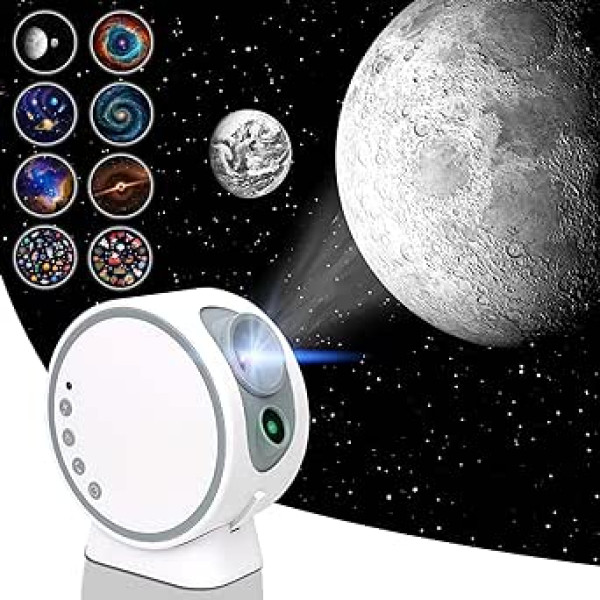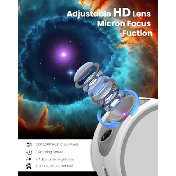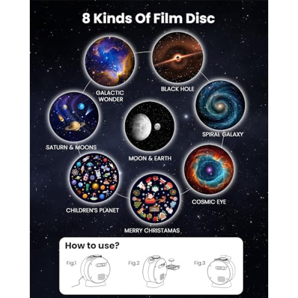 HD images with manual focus adjustment: MERTTURM Home Planetarium projector allows you to immerse yourself in the light of the universe by showing the vibrant, bright and sharp HD image and it can be slowly rotated to show different views of the dreamy room-like atmosphere. It uses LED projection, focus ring and green star laser, create an even more realistic feeling of being under the night sky. 8 vivid image discs collection: MERTTURM star projector for bedroom comes with 8 content discs. ①Galactic Miracle; ② Black Hole; ③Saturn & Moons; ④Moon & Earth; ⑤Spiral Galaxy; ⑥Cosmic Eye; Children's Planet; Merry Christmas. Suitable for children, gamers, space fans, atmosphere adjustment and so on. 12 white noise and sleep timers: While additional 12 white sounds can help you drift to sleep, the automatic timer with 15/30/60 minutes can help to automatically shut down the projector, no worry about forgetting to turn off the device. 3 brightness levels for night light and protect you and your family sleep quality. Bluetooth speaker and music sync flash via remote control: Built-in BT speaker, connect to the mobile phone to play our favourite songs. Select the desired light effect with the remote control. When you press \