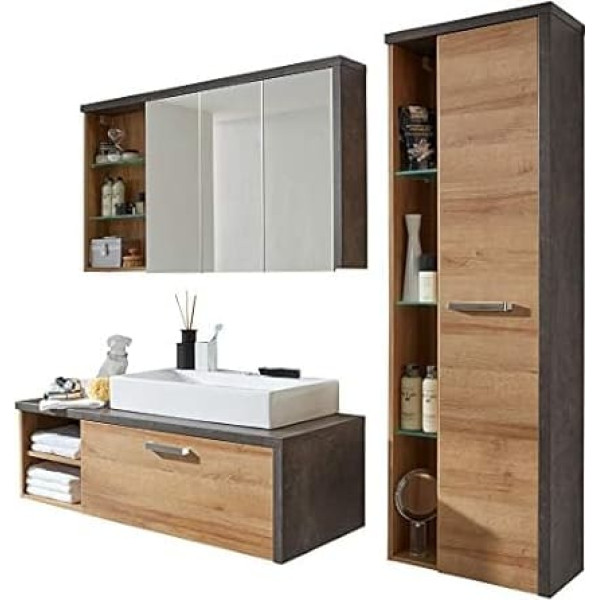 Modern, easy-care combination including sink in concrete stone body, front oak Riviera honey Dimensions: 186 x 160 x 53 cm (assembled W x H x D). Includes furniture, assembly instructions and assembly material. Delivered disassembled and without decoration The product complies with the requirements of the Product Safety Act in terms of ensuring safety and health Individual furniture and set combination available This product is packed in two or more boxes. You can receive it on different days.
