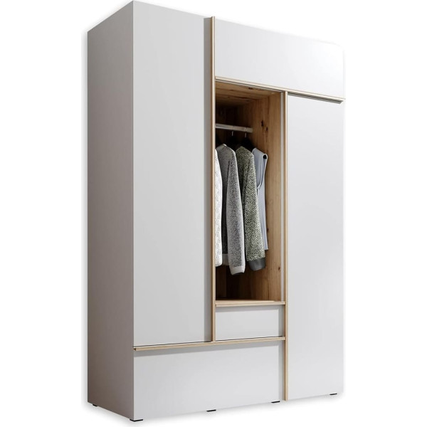 Modern – The cabinet scores in futuristic style in white with panels in Artisan oak. Special clothes can be hung visible through the cut-out in the middle of the wardrobe. Lots of storage space – with its generous dimensions and refined interior, the cabinet provides plenty of storage space to store clothes neatly and orderly. Versatile – the cabinet feels comfortable thanks to the timeless design and colour scheme in different interior styles. Especially in a minimalist and modern living style, it blends seamlessly. Easy to assemble – the wardrobe is quick and easy to assemble thanks to detailed instructions (English language not guaranteed) and therefore suitable for beginners. The mounting material is included. Dimensions: 135 x 204 x 59 cm (W x H x D). STELLA TRADING - Furniture is our passion. We stand for the best quality and for this reason we only work with carefully selected and well-known suppliers. This product is sent in several packages. They can be delivered at different times