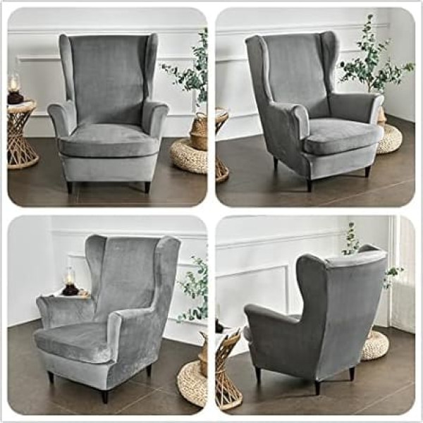 Highdi 2-Piece Velvet Wing Chair Cover with Ottoman Protective Cover, Armchair Throws, Wing Chair Protective Covers, Stretch Tiger Chair Cover with Armrest, High Backrest (Grey)