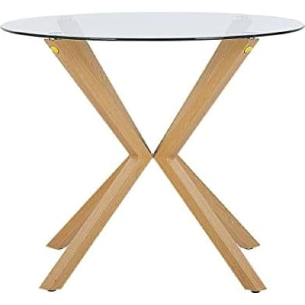 Timeless dining table in Scandinavian and minimalist look Round table top made of transparent tempered glass Star shaped table legs made of metal in wood look Scandinavian design fits all modern interior styles; Product description Round dining table with transparent safety glass top. Finally make a clean table with your interior and get this stunning piece of furniture right into your dining room. The transparent, round table top made of durable safety glass enchants with its delicate, airy and subtle style, which decoratively decorates but does not dominate the room. The dining table can accommodate at least 4 people and is very stable thanks to the steel construction. The sturdy metal legs in wood look are a real finishing touch thanks to the star-shaped design. Details: Dining Room Table Type Style: Modern Colour: transparent, light wood colour. Material type: glass. Material: safety glass. Additional material: steel. Frame material: steel. Table top material: glass. Shape: round. Finish: Laminated Dimensions: Width: 90 cm Length: 90 cm Height: 75 cm. Weight: 15 kg. Max. Load capacity: 150 kg. You are buying: 1 x table. Product advantages: Sturdy table top made of safety glass, classic design, fits wonderfully with any interior style, long service life, very easy to clean and durable. Installation: Legs / feet not assembled. 45 - 60 minutes.; Product description Round dining table with transparent safety glass top. Finally make a clean table with your interior and get this stunning piece of furniture right into your dining room. The transparent, round table top made of durable safety glass enchants with its delicate, airy and subtle style, which decoratively decorates but does not dominate the room. The dining table can accommodate at least 4 people and is very stable thanks to the steel construction. The sturdy metal legs in wood look are a real finishing touch thanks to the star-shaped design. Details: Dining Room Table Type Style: Modern Colour: transparent, light wood colour. Material type: glass. Material: safety glass. Additional material: steel. Frame material: steel. Table top material: glass. Shape: round. Finish: Laminated Dimensions: Width: 90 cm Length: 90 cm Height: 75 cm. Weight: 15 kg. Max. Load capacity: 150 kg. You are buying: 1 x table. Product advantages: Sturdy table top made of safety glass, classic design, fits wonderfully with any interior style, long service life, very easy to clean and durable. Installation: Legs / feet not assembled. 45 - 60 minutes.; Round dining table with transparent safety glass top. Finally make a clean table with your interior and get this stunning piece of furniture right into your dining room. The transparent, round table top made of durable safety glass enchants with its delicate, airy and subtle style, which decoratively decorates but does not dominate the room. The dining table can accommodate at least 4 people and is very stable thanks to the steel construction. The sturdy metal legs in wood look are a real finishing touch thanks to the star-shaped design. Details: Dining Room Table Type Style: Modern Colour: transparent, light wood colour. Material type: glass. Material: safety glass. Additional material: steel. Frame material: steel. Table top material: glass. Shape: round. Finish: Laminated Dimensions: Width: 90 cm Length: 90 cm Height: 75 cm. Weight: 15 kg. Max. Load capacity: 150 kg. You are buying: 1 x table. Product advantages: Sturdy table top made of safety glass, classic design, fits wonderfully with any interior style, long service life, very easy to clean and durable. Installation: Legs / feet not assembled. 45 - 60 minutes.