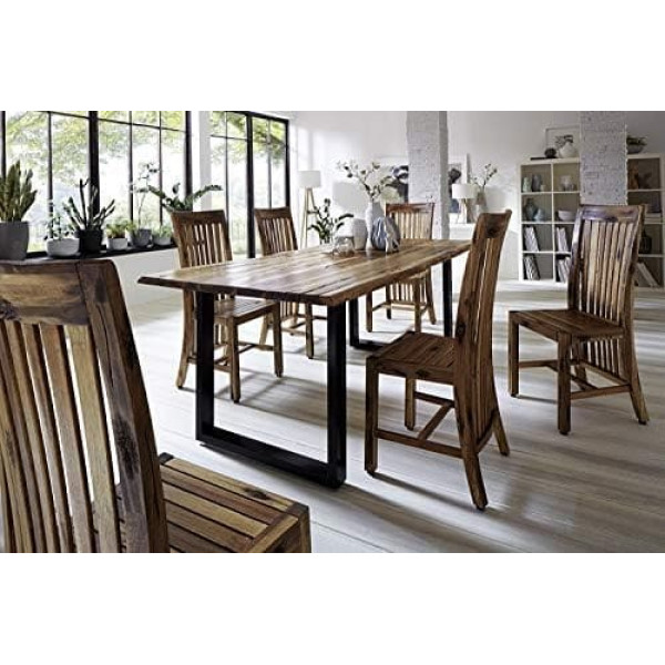Exclusive wooden table with a 35 mm thick table top made from real tree edge; this will make a unique item in your dining room. The rustic table legs made of black lacquered pig iron form a successful counterpart to the modern table top. The dining table with a length of 180 cm offers enough space for the whole family The natural, oiled acacia wood is rounded at the edges to protect against injury Other available sizes and legs of this table can be found in our online shop