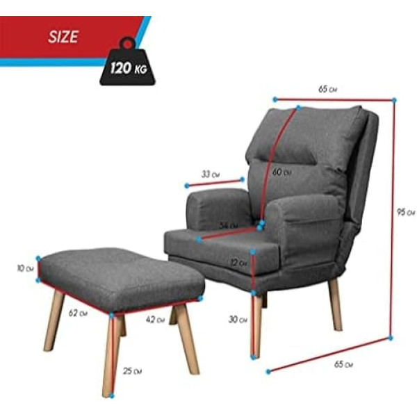 Relaxation and stress relief. The fabric of the chair feels very comfortable and its profiling makes the chair perfect for resting after a busy day. Sit back and relax with your favorite book, music or movie. Stylish and elegant design. The armchair fits well into any type of interior, regardless of its decor. Its modern Scandinavian style will liven up your interior. It is perfect for the office, living room or bedroom. The padded backrest allows you to freely arrange the furniture in the room. Comfortable and comfortable. Armchair with 5-level backrest adjustment. The chair can be used for sitting. half loungers or loungers, which allows us to relax in our favourite position. High quality finish. The sleeping chair and footrest are made of high-quality fabric with precision and attention to detail, making them very durable and can be used for many years without losing their original appearance over time. These features make the set look beautiful and aesthetic and will attract the attention of many people. The set is easy to clean, the material used prevents the absorption of liquids. Direct from the manufacturer. The company Grekpol is a manufacturer and ensures the highest quality of the materials and manufacturing used. Everything is made in the European Union, so you can be sure that each item is carried out with the utmost care.; Product description Scandinavian wing chair. Perfect for winter evenings in the living room with a cup of hot tea and your favorite book. It is also popular with people who like to lie comfortably in an armchair after a hard day at work and relax while watching a movie or a series. Its functionality will also prove useful when breastfeeding in a half-lying position - it is the most comfortable way for young mothers to breastfeed their baby. The chair is ergonomic and so versatile that it is popular: For young mothers when breastfeeding (safe and comfortable half-lying position, ideal for breastfeeding). For a teenager's room as a gaming chair (perfect for playing on a console). For a senior, so that he can sit on the chair for a long time (the position can be changed, so the spine is not strained). For lovers of good books and films who attach great importance to comfortable positions. For lazy people who like to take short naps during the day. Its modern Scandinavian style will liven up your interior. Profile armrests, footrest and adjustable backrest stand out positively from other TV armchairs. Some technical data for the chair: The metal frame is covered with highly flexible foam that adapts to the body after a minute, in combination with a durable fabric, we get a comfortable and stylish wing chair with a load capacity of up to 150 kg. Thanks to a solid, 25 cm high leg made of beech wood, the chair adopts a fashionable Scandinavian style. The five-level adjustment means comfort, whether we want to sit or lie down longer. The fabric visible in the photos is Solo. It is a velvet upholstery fabric that feels very comfortable and has a luxurious, shiny texture. A big advantage of the furniture fabric Solo is the easy to clean coating, which means that the spilled liquid is not absorbed into the material and remains on the surface. Chair dimensions: (exact dimensions in the photo in the gallery). Width: 75 cm Depth: 75 cm. Seat depth: 60 cm. Seat height: 35 cm. Footrest dimensions: Width: 62 cm Depth: 42 cm Height: 35 cm. Technical data summary: - We are a manufacturer. - 5-stage backrest adjustment. - Padded with high-quality fabrics. - High-quality manufacturing. - Legs made of beech wood with felt on the underside. - Backrest can be folded out in five positions. - Made in the EU. - Two large pockets on the sides. - Load capacity up to 150 kg. - 24-month warranty - Free footrest. Assembly – The set contains 1 x chair and 1 x footrest. The product is carefully packaged so that it is not damaged in transit. To fully use the set, you need to assemble the legs yourself. Thanks to the enclosed instructions and the necessary accessories, assembly is extremely quick and easy.; Product description Scandinavian wing chair. Perfect for winter evenings in the living room with a cup of hot tea and your favorite book. It is also popular with people who like to lie comfortably in an armchair after a hard day at work and relax while watching a movie or a series. Its functionality will also prove useful when breastfeeding in a half-lying position - it is the most comfortable way for young mothers to breastfeed their baby. The chair is ergonomic and so versatile that it is popular: For young mothers when breastfeeding (safe and comfortable half-lying position, ideal for breastfeeding). For a teenager's room as a gaming chair (perfect for playing on a console). For a senior, so that he can sit on the chair for a long time (the position can be changed, so the spine is not strained). For lovers of good books and films who attach great importance to comfortable positions. For lazy people who like to take short naps during the day. Its modern Scandinavian style will liven up your interior. Profile armrests, footrest and adjustable backrest stand out positively from other TV armchairs. Some technical data for the chair: The metal frame is covered with highly flexible foam that adapts to the body after a minute, in combination with a durable fabric, we get a comfortable and stylish wing chair with a load capacity of up to 150 kg. Thanks to a solid, 25 cm high leg made of beech wood, the chair adopts a fashionable Scandinavian style. The five-level adjustment means comfort, whether we want to sit or lie down longer. The fabric visible in the photos is Solo. It is a velvet upholstery fabric that feels very comfortable and has a luxurious, shiny texture. A big advantage of the furniture fabric Solo is the easy to clean coating, which means that the spilled liquid is not absorbed into the material and remains on the surface. Chair dimensions: (exact dimensions in the photo in th