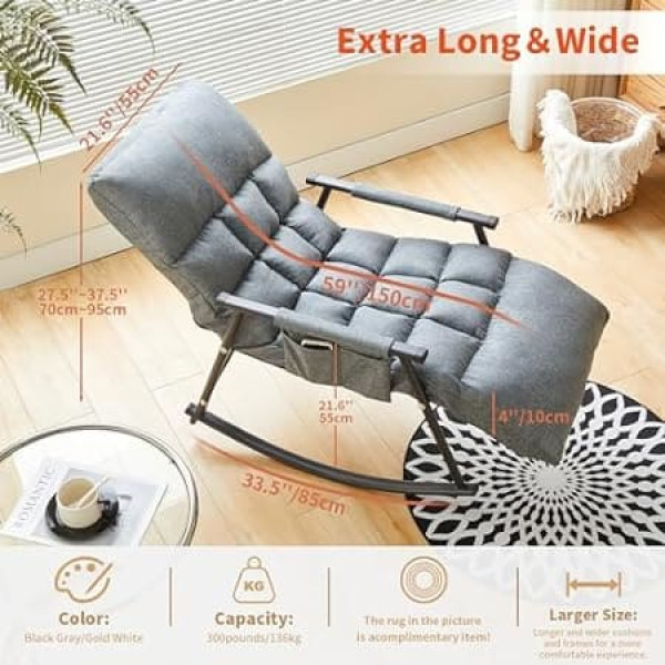 Kaihaowin Rocking Chair with 5-Way Adjustable Backrest and Footrest, Swing Chair with Side Pocket for Living Room, Bedroom, Grey Black