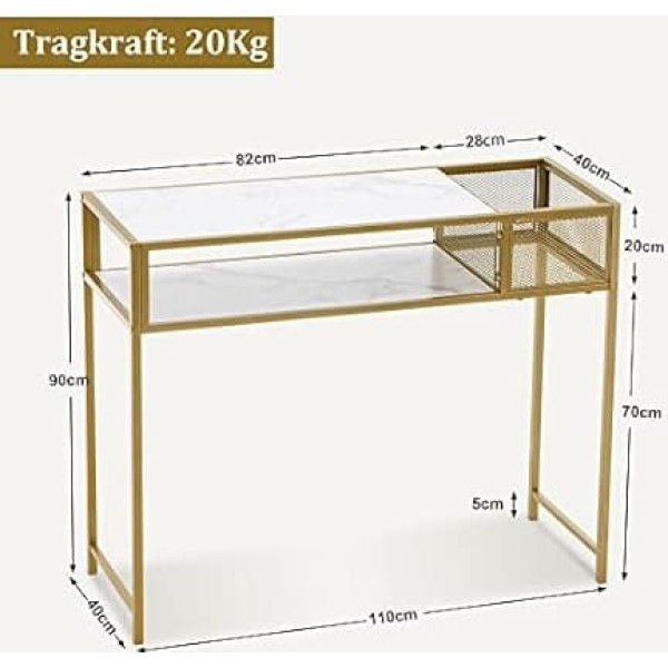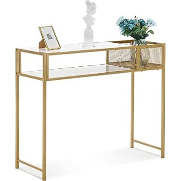 Modern Style --- The white faux marble table top and golden frame structure makes the hallway table simple, elegant and luxurious. The console table is absolutely a real eye-catcher in any environment and is guaranteed to give your room an elegant flair. Stable and durable: this console table is made of high-quality steel frame and MDF board with a thickness of 15 mm, which ensures a load capacity of 20 kg. Non-slip foot pads prevent scratching of the floor. Large storage space --- Spacious table top, a shelf and basket provide sufficient open storage space for artwork, elegant vase and your favourite book. So you can set your decoration perfectly in the spotlight. Assembly & Cleaning --- With marked parts and clear instructions, assembling this shelf is a breeze. Replacement screws and tools are included. Table top can be wiped clean with a damp cloth. Multi-purpose sofa table: Due to the narrow body (100 x 30 x 79 cm), the table can be placed in any limited space, ideal for entrance area, dining room, living room, bedroom. Other information: this console table is delivered disassembled without decoration.