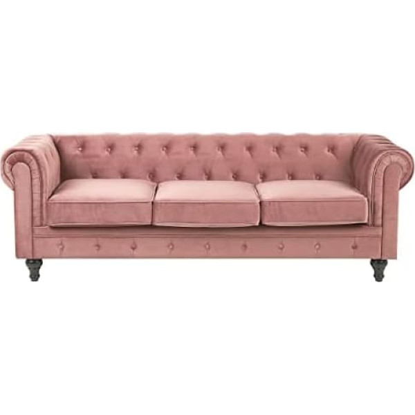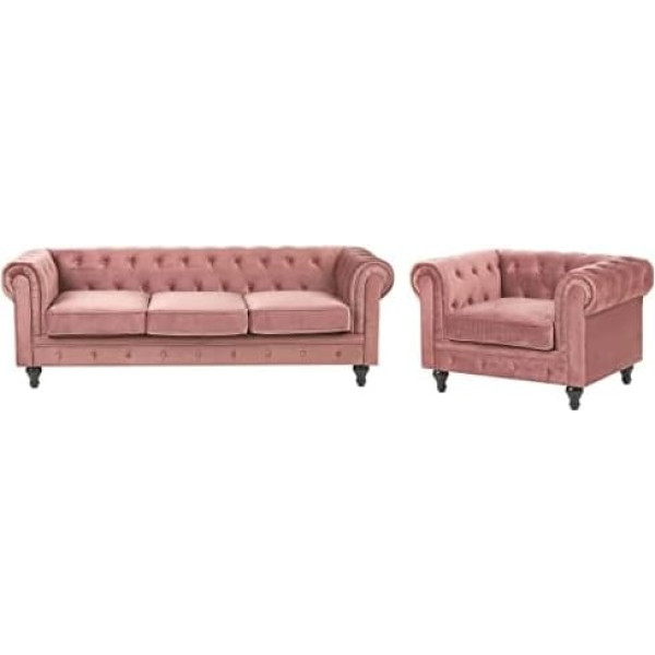 Classic, cosy set consisting of a 3 seater sofa and an armchair in timeless Chesterfield style All-round cover made of easy-care velvet fabric, feet made of solid wood, base made of strong eucalyptus wood The high, wide armrests, a comfortably shaped backrest and the wide, deep shape of the 4-seater invite you to relax Cosy appearance, stylish elegance, first-class seating comfort and the highest quality; Product description Classic set in traditional English style. Classic design meets comfortable cosiness in this timeless set among upholstered furniture. The all-around cover is made of high-quality velvet fabric in elegant pink and features the signature button decoration on the beautifully rounded back and armrests. The wide and deep shape of the comfortable set invites you to relax. Details: Type: Chesterfield Sofa Style: Glamorous Colour: pink, black. Material type: fabric. Material: velvet fabric. Additional material: rubberwood Filling material: foam. Composition: 100% polyester. Armrests: Rounded Back with padded cover: yes. Seat construction: wave suspension. Foam density: 24 kg/m3. Number of seats: 4 - 6 people. Dimensions: Sofa 3-seater: 201x75x70 Armchair: 110x75x70 Cushion thickness: 15 cm. Seat height: 45 cm. Total dimensions: 201 x 75 x 70. Weight: 76 kg. Max. Maximum load: 150 kg. You are buying: 1 x three-seater, 1 x armchair. Product advantages: Thick padding for maximum comfort, traditional design with a modern touch, refined with decorative button stitching, high-quality material, solid workmanship, all-round cover and therefore can be freely placed in the room, protective caps to protect the floor. Installation: Legs / feet not assembled. 5 - 15 minutes.; Product description Classic set in traditional English style. Classic design meets comfortable cosiness in this timeless set among upholstered furniture. The all-around cover is made of high-quality velvet fabric in elegant pink and features the signature button decoration on the beautifully rounded back and armrests. The wide and deep shape of the comfortable set invites you to relax. Details: Type: Chesterfield Sofa Style: Glamorous Colour: pink, black. Material type: fabric. Material: velvet fabric. Additional material: rubberwood Filling material: foam. Composition: 100% polyester. Armrests: Rounded Back with padded cover: yes. Seat construction: wave suspension. Foam density: 24 kg/m3. Number of seats: 4 - 6 people. Dimensions: Sofa 3-seater: 201x75x70 Armchair: 110x75x70 Cushion thickness: 15 cm. Seat height: 45 cm. Total dimensions: 201 x 75 x 70. Weight: 76 kg. Max. Maximum load: 150 kg. You are buying: 1 x three-seater, 1 x armchair. Product advantages: Thick padding for maximum comfort, traditional design with a modern touch, refined with decorative button stitching, high-quality material, solid workmanship, all-round cover and therefore can be freely placed in the room, protective caps to protect the floor. Installation: Legs / feet not assembled. 5 - 15 minutes.; Classic set in traditional English style. Classic design meets comfortable cosiness in this timeless set among upholstered furniture. The all-around cover is made of high-quality velvet fabric in elegant pink and features the signature button decoration on the beautifully rounded back and armrests. The wide and deep shape of the comfortable set invites you to relax. Details: Type: Chesterfield Sofa Style: Glamorous Colour: pink, black. Material type: fabric. Material: velvet fabric. Additional material: rubberwood Filling material: foam. Composition: 100% polyester. Armrests: Rounded Back with padded cover: yes. Seat construction: wave suspension. Foam density: 24 kg/m3. Number of seats: 4 - 6 people. Dimensions: Sofa 3-seater: 201x75x70 Armchair: 110x75x70 Cushion thickness: 15 cm. Seat height: 45 cm. Total dimensions: 201 x 75 x 70. Weight: 76 kg. Max. Maximum load: 150 kg. You are buying: 1 x three-seater, 1 x armchair. Product advantages: Thick padding for maximum comfort, traditional design with a modern touch, refined with decorative button stitching, high-quality material, solid workmanship, all-round cover and therefore can be freely placed in the room, protective caps to protect the floor. Installation: Legs / feet not assembled. 5 - 15 minutes.