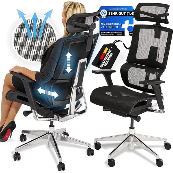 Excellent lording support – is the M7 office chair ergonomic? With the elastic adaptive lumbar support, the VALKENSTOL M7 offers optimal comfort and individual support for the hips and back. Due to its outstanding ergonomic properties, the M7 has been officially certified by the Institute of Health and Ergonomics as an ergonomic product. Fresh and cool – the breathable mesh fabric of your office chair ensures optimal ventilation and keeps you fresh even on long working days 24/7. So you can keep more than just a cool head! TRUERGO TECHNOLOGY – Thanks to Truergo, a perfectly coordinated combination of adaptive lumbar support, depth-adjustable seat, 3D armrests and 2D headrest: to promote a healthy and upright sitting posture. Your ergonomic office chair ensures optimal body adaptation, so that you can focus 100% on your work every day. Even after long work sessions or video calls, you will radiate maximum energy! Robust and durable – your ergonomic office chair effortlessly supports a weight of up to 155 kg. Please note: we have designed the mesh seat, the height-adjustable backrest and the adaptive lumbar support for an ideal comfort zone between 1.60 to 1.80 m and 70 to 100 kg Maximum freedom – thanks to the rotating wheels, forward tilting seat and back surface as well as the backrest adjustable up to 130 degrees, you will experience active ergonomic sitting, maximum relaxation at the desk and flexible movement in all directions. See for yourself and order today!