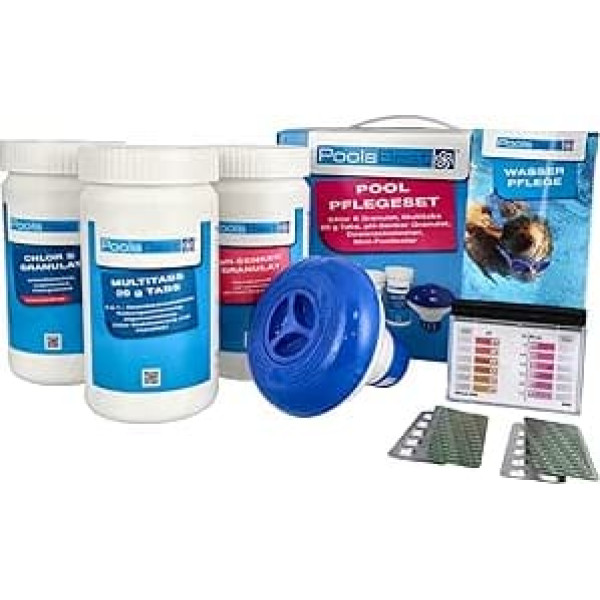 PoolsBest brand quality starter chlorine set suitable for pool beginners. 1kg of fast-dissolving chlorine S granules. 1kg of mini Multitabs 5-in-1, 20g tabs. 1.5kg of pH reducer for optimal pH regulation. 1 x mini dosing float and mini pool tester for chlorine and pH.