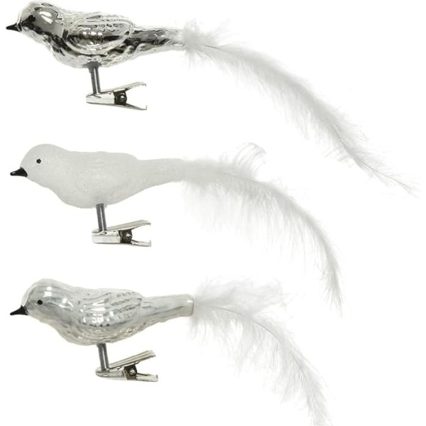 Kaemingk Christmas Tree Decoration Glass 8 cm x 3 Pieces Birds on Clip Christmas Baubles Mix Silver White