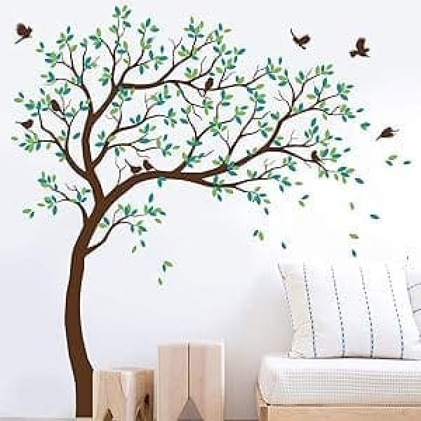 Large Tree Wall Sticker Children's Room Wall Tree Sticker with Birds Tree Wall Sticker Wall Sticker Vinyl Wall Decor KW032 (Branches to the Right, Brown, Lime Green, Turquoise)