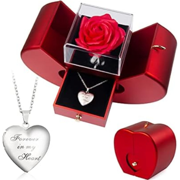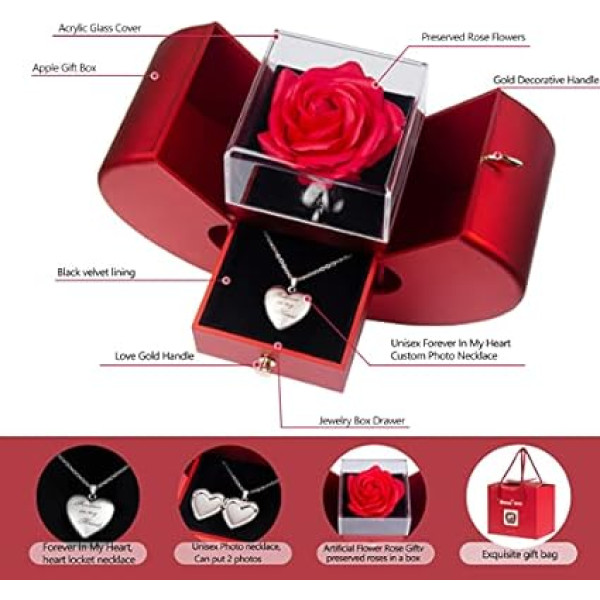 Preserved Rose Apple Box Rose Box Eternal Rose with Jewellery Forever in My Heart Photo Necklace Preserved Rose in Glass with Chain Roses Infinity Rose Anniversary Valentine's Day Mother's Day