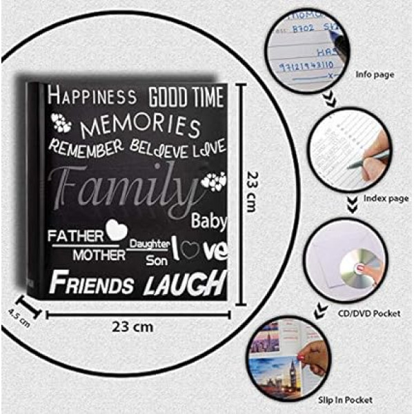 Ideal gift: great Christmas gift for family and friends, anniversary gift, Valentine's Day gift, Mother's Day gift, Father's Day gift, baby birthday gift, Thanksgiving, New Year gift, Halloween gift, holiday gift, Easter gift, grandparents' day gift, secretary day gift, happy hour, wedding book, wedding guest book, photo storage, photo storage, travel day gift, travel day gift, travel day gift, holiday gift, holiday gift, holiday gift, holiday gift, business gift, advertising promotion, opening ceremony, and many other special occasions. Album Size This photo album is approx. 23 x 23 x 4 cm. 5 cm. It comes with 50/sheets, 100/pages and each page shows two photos. Up to 200 capacities for 4x6 landscape photos. The slip-in album contains clear plastic sleeves to fit your photo. This is the perfect option for those of us who may alternate where photos are placed or want to change them at a later date for another to organize all the pictures perfectly. HIGH QUALITY ALBUM - Arpan exclusive photo album is made of superb hard card stock that is sturdy and durable to last for many years. Your pictures and memories will be preserved in a very special black text art cover slip-in photo album organiser. Acid free pages with labeling field. Additional Features: Album specially designed to create wonderful memories for photo lovers, use memo writing area if you plan to include remarks, dates, names or even small stories with your photos. Page for personal information such as your name, phone number, email, address, use the index pages to jot down important information about your memorable moments, with a CD/DVD pocket on the back for video or sound that will bring back further fund times CREATE MEMORIES Create long-lasting memories and keep them safe so you can share them with your loved ones in the future in this premium travel capture or adventure memory books from Arpan. It is not only super practical, but also beautiful black text as a perfect gift for all occasions.