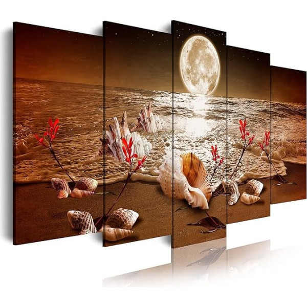DekoArte 436 - Modern Picture, Digitised Art Print, Decorative Picture for the Salon or Bedroom | Style Landscape Night Moonlight on the Beach Red Flowers | 5 Pieces 150 x 80 cm