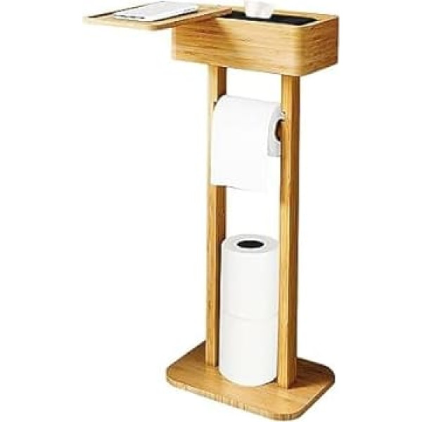 【Multifunctional Design】This freestanding toilet paper holder is equipped with a storage box for personal items, ensuring privacy and cleanliness. The top lid of the box rotates 360 degrees and serves as a temporary table for your phone, notepad, book and other items. This relieves hand and neck while keeping items safe and within easy reach. 【Extra Storage for Toilet Paper Rolls】: The bottom shelf of the holder can hold a roll of used toilet paper and two extra rolls, preventing the embarrassment of suddenly running out of paper. Never worry about running out of toilet paper again! 【Stylish Bamboo Material】:Our toilet paper holder stand is made of eco-friendly bamboo and provides both storage space and a stylish addition to your bathroom decor. Its natural look matches a variety of decor styles, from modern to rustic. 【STURDY & DURABLE】:Our double column design toilet paper stand is more stable than others with single column design, ensuring that the paper roll will not slip from one side and the top box will not tilt. The size of the assembled toilet stand is 9.8 (L) x 7.9 (W) x 25.4 (H) inches. Suitable for your home bathroom. 【EASY ASSEMBLY & INSTALLATION】The toilet paper holder is easy to assemble and install, all necessary parts are included. Add this practical and stylish bathroom accessory to your home today and enjoy a more organized and comfortable bathroom experience.; Product description 360 Rotating Lid: As a temporary desk for phones, tablets, books and more. Open the lid without moving items on it. Storage box: The box can store flushable wipes, sanitary napkins, trash bags, medicines and other items. Paper roll holder: Smooth rolling without one-sided slipping. Double columns: More stable with double columns instead of just one. Storage of replacement paper rolls: 2-3 additional roll storage to prevent you from running out of paper.; Product description 360 Rotating Lid: As a temporary desk for phones, tablets, books and more. Open the lid without moving items on it. Storage box: The box can store flushable wipes, sanitary napkins, trash bags, medicines and other items. Paper roll holder: Smooth rolling without one-sided slipping. Double columns: More stable with double columns instead of just one. Storage of replacement paper rolls: 2-3 additional roll storage to prevent you from running out of paper.; 360 Rotating Lid: As a temporary desk for phones, tablets, books and more. Open the lid without moving items on it. Storage box: The box can store flushable wipes, sanitary napkins, trash bags, medicines and other items. Paper roll holder: Smooth rolling without one-sided slipping. Double columns: More stable with double columns instead of just one. Storage of replacement paper rolls: 2-3 additional roll storage to prevent you from running out of paper.