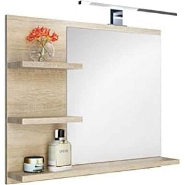 DOMTECH Bathroom Mirror with Shelves and LED Lighting Oak Bathroom Mirror Wall Mirror LED Wall Lamp L