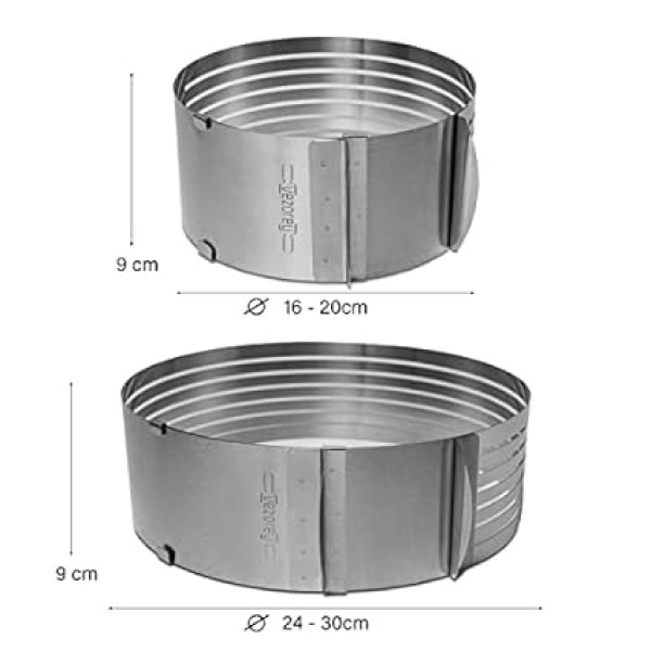 Stainless steel – all parts of the set are made of stainless steel. This means that they are certified food-safe and dishwasher-safe. Extra stable - The high material thickness ensures precise cutting and smooth adjustment. The thick-walled rings prevent the layers from wobbling and slipping when cutting. 4-piece set – all components are coordinated in their dimensions. This means that all floors can be easily handled from the smallest to the largest diameter. Technical data: small cake ring 16-20 cm, large cake ring 24-30 cm, cake knife blade length 30 cm, cake server surface 27 x 26 cm Easy to use – thanks to the cake base cutting set, perfect floors for layered cakes can be cut in just a few simple steps.