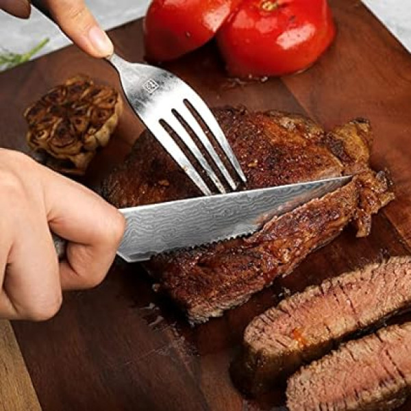 KEEMAKE Steak Cutlery Set 4-Piece Damask Steak Knife with Serrated Edge and Steak Fork Made of Japanese VG-10 Core & 67 Layers Damascus Steel, Cutlery with Exquisite Wooden Gift Box
