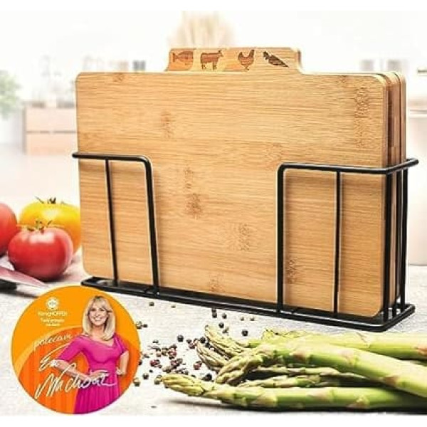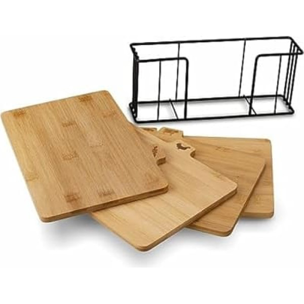 Bamboo board set. A set of bamboo kitchen boards in a black metal stand. Set of 4 wooden boards. 29 x 21 x 7 cm Wooden chopping board set. You improve the preparation of dishes with meat, vegetables, fish and more. You can use the set as a practical and tasteful gift. You can comfortably keep each of the cedar kitchen boards clean Wooden boards kitchen set. Each board is intended for a specific product group, which is characterised by wooden labels. Four hard bamboo boards accelerate work in the kitchen and daily care Board stand 4 bamboo boards. Dimensions: 28 x 20 x 1 cm. Dimensions of the work surface: 28 x 18 cm. Metal stand. Dimensions: 29 x 7 x 12.5 cm; Product description Four kitchen boards speed up work in the kitchen. This makes the preparation of individual dishes more efficient. The large surface area of each board ensures comfortable cutting and chopping. Bamboo wood facilitates maintenance as it is hard and well protected from discolouration and odours.; Product description Four kitchen boards speed up work in the kitchen. This makes the preparation of individual dishes more efficient. The large surface area of each board ensures comfortable cutting and chopping. Bamboo wood facilitates maintenance as it is hard and well protected from discolouration and odours.; Four kitchen boards speed up work in the kitchen. This makes the preparation of individual dishes more efficient. The large surface area of each board ensures comfortable cutting and chopping. Bamboo wood facilitates maintenance as it is hard and well protected from discolouration and odours.