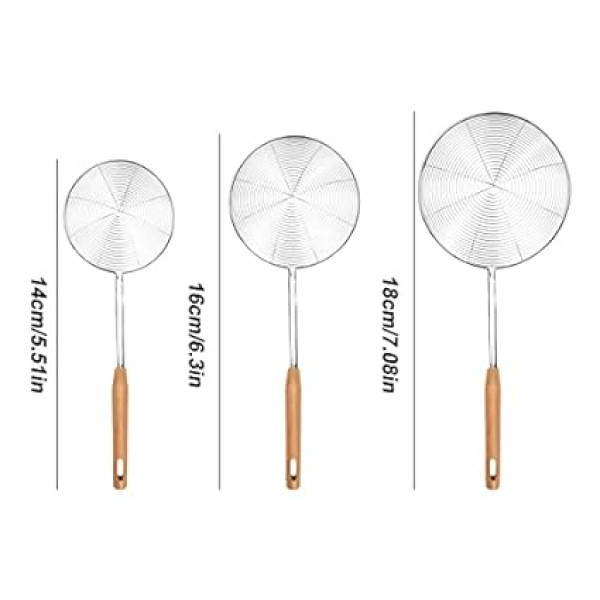 Suuwwn Stainless Steel Cooking Skimmer, Set of 3 Skimmer Spoons 5.5 6.3 7 Inch Spider Sieve Skimmer Cooking Utensils Sieve with Wooden Handle Spider Web Pan Wire Skimmer Slot Spoon