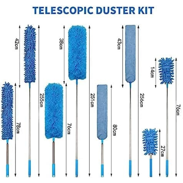 5 pieces microfibre cleaning set: the microfibre cleaning set contains 5 dust brush heads of different sizes and a stainless steel telescopic rod. The duster telescopic can better clean dead corners at high height and effectively remove dust and cobwebs from the ceiling. The mini duster is suitable for cleaning computers, TVs, desks, cars etc. This is the perfect cleaning combination set. Please note: the telescopic rod and the microfiber brush are packed in the same bag, which is not very visible but will be visible when the bag is opened. High-quality fibre material: the duster is made of high-quality microfibre material, which has super dust-absorbing properties. The fluffy microfibre and soft rubber on the top ensure that the surface of the sofa, furniture or wall is not scratched when cleaning. Microfibre duster high-density and ultra-soft fibre padding prevents dust from spreading back into the air like a normal duster. Multifunctional telescopic duster: the stainless steel telescopic rod is for microfibre dusters, chenille dust brush and flat dust collector. The freely adjustable length range of the telescopic rod is 76-256 cm. Microfibre duster for cleaning ceiling fans, ceiling spider webs, and other large aerial work, chenille dust brush also absorbs coarse dirt. The flat dust collector is suitable for cleaning dust in the crevices of blinds, sofas, beds, furniture floors. Flexibility and stability: the microfibre brush is flexible and flexible. You can easily bend it into different angles to wipe any small gap or hidden area in your home with ease. The telescopic rod is made of high quality stainless steel, the non-slip design of the handle and the screw design on the interface of the telescopic rod reinforces the connection to the dust removal head, ensuring more safety when using. Easy to clean and store: the duster is removable and easy to clean. Simply remove the fibre cover from the duster and it is easy to clean with warm water! (The microfibre brush head does not need to be disassembled and can be cleaned directly). Reusable after air drying, can be stored in a drawer or tool box to save space. The stainless steel telescopic rod has handle holes at the bottom and can also be hung on the wall or door.