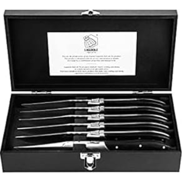Set of 6 stainless steel steak knives. With luxurious ebony handle Sharp, smooth cut for cutting different types of meat. Beautifully crafted metal with unique embellishment. Comes in a luxury wooden box. Blade length: 10 cm. Total length: 22.5 cm. Metal Thickness: 2.5mm Laguiole is not a registered trademark. The word \