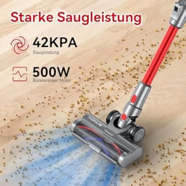【Foldable Cordless Vacuum Cleaner】The aonus A9 vacuum cleaner uses a foldable design, which can be cleaned anytime and anywhere and is not restricted by limited space. 40Kpa + 500W brushless motor: uses an efficient brushless motor that produces a strong suction power of 40Kpa and a high power of 500W and can deeply clean various surfaces and embedded dust. 【LED Intelligent Control Panel】: clearly displays the current suction power, remaining battery life and error status to help users use the vacuum cleaner. Dust detection: Real-time detection of dust content and automatic adjustment of suction power according to the dust content to make cleaning smarter. 【Tangle Free Floor Brush】: Uses a new floor brush, which effectively prevents hair from getting caught to make cleaning smoother. 7 x 2500 mAh large battery: the battery life is up to 60 minutes and meets daily cleaning needs. 【6-stage filter system】: can effectively filter 99.99% of dust and bacteria and prevent secondary pollution. 【Support for Various Accessories】: The vacuum cleaner is equipped with various accessories and can meet different scenarios and cleaning needs, such as cleaning sofas and cars.