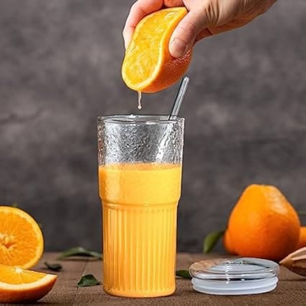 Joeyan 650 ml Drinking Cup with Lid and Straw, Set of 2 Ribbed Stripes Drinking Bottle for Smoothie Coffee Cold Brewed Tea Milk, Long Drink Glasses, Iced Coffee Glasses, Dishwasher Safe