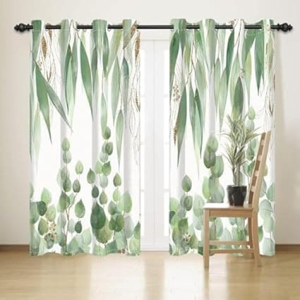 Uiiooazy Eucalyptus Curtains, Green Leaves Plants Textile Curtains, Opaque Polyester Curtain, Blackout Curtains with Eyelets for Living Room, Bedroom, Window, Balcony, Set of 2, 140 x 245 cm