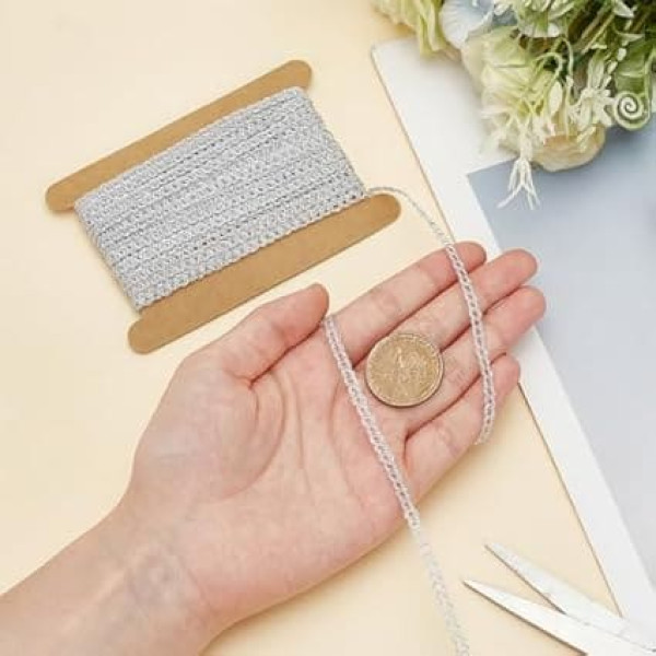 FINGERINSPIRE 9,1 m Metallischer Zopfborte, 0,3 cm breit, silberfarben, metallisch, Gimpenborte, Wellenmuster, Nähband, Nylon-Verzierung, Spitzenborte mit Wellenkante, Spitzenborte für Party,