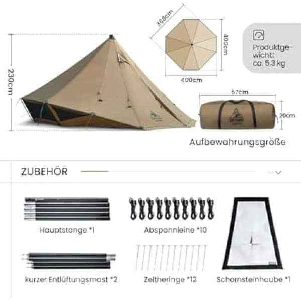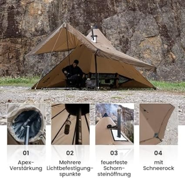 Durable and tear-resistant: camping tent made of waterproof, lightweight, durable ripstop nylon 70D (one-sided silicone coating and tear-resistant). The fabric is durable and stretchy, making it lighter and more durable than polyester. Waterproof and windproof: 3000 mm waterproof, with silicone coating and waterproof taped seams. The hem can be fully opened so you can enjoy the ventilation and comfort. The 4-person tent has snow skirt to prevent the ingress of snow, wind, rain and insects and shield the inside and outside. Easy to assemble: 2 person tent has a positioning rope (removable), which makes it easier to set up and adjust. Setting up the porch: stowable entrance fabric for folding away to create a front porch for camping furniture or a campfire. REINFORCED ATTACHMENT POINTS The tent pole tip is finished with a scratch-resistant ripstop coating, so it does not tear or fray easily. Compatible with oven: ideal for winter camping with snow guard, flue pipe opening and cooking connection, with a 3D ventilation system via specially developed ventilation openings. Suitable for multiple campers: octagonal, extra spacious house tent. Comfortable space for up to 3 campers, with plenty of room for gear. This waterproof single-pole tent is versatile, e.g. For leisure activities, camping and barbecues by the sea, in the mountains, on rivers, in yards, picnics and outdoor activities. › See more product details