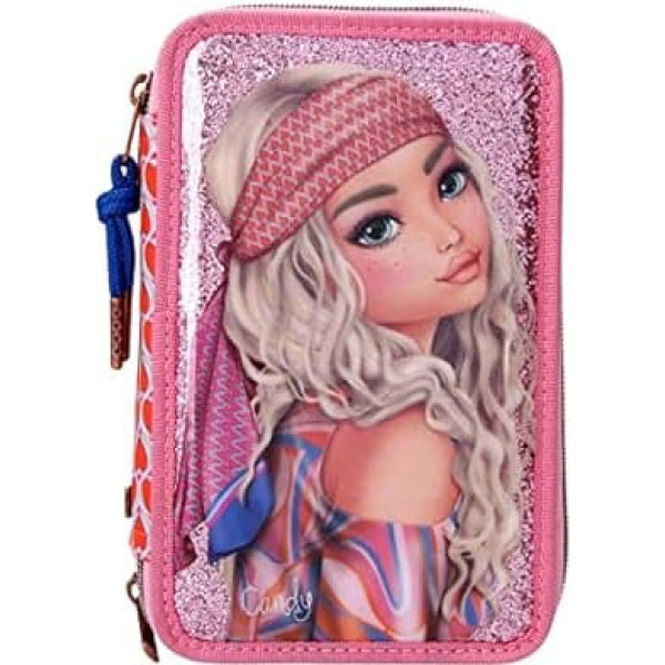 Depesche 11977 TOPModel Seventies - Filled 3-Compartment Pencil Case with Glitter, Model Motif and Heart Pattern, Pencil Case in Pink with Colouring Pencils, Ruler, Scissors and Much More
