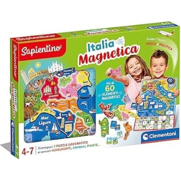 Italian game: a magnetic puzzle to rebuild Italy with the 20 shaped regions. Once assembled, the puzzle becomes a large table that can be hung with physical and political Italy Geography for Children: a political map of Italy hanging that introduces the child to the first information of Italian geography. Lots of insights on regional monuments and typical, additional maps about plants and animals typical of the beautiful country Contents of the game: a magnetic scoreboard with the map of Italy, shaped magnetic regions, magnetic maps about animals and plants of each region, and an illustrated 32-part book with lots of curiosity about our country Educational Game Your child will have fun with the magnetic components by practicing dexterity. The silhouettes of the regions include images of monuments and typical of the different regions to make the educational experience even richer. Details: A Sapientino educational game about the geography of Italy suitable for preschool age, recommended from 4 to 7 years. Discover all products of the Sapientino magnetic line from Clementoni! › See more product details; Product description Product Description A magnetic puzzle to build Italy with the 20 shaped regions. Once assembled, the puzzle becomes a large board that can be hung with physical and political Italy. A political hanging map from Italy that introduces the child to the first knowledge of Italian geography. Lots of insights on regional monuments and typicals - additional maps about plants and animals typical of the beautiful country. Game content: a magnetic game board with the map of Italy, shaped magnetic regions, magnetic maps on animals and plants of each region and a 32-piece illustrated book with many curiosities about our country. Your child will have fun with magnetic components by practicing their skills. The region silhouettes include images of monuments and typical of the different regions to make the educational experience even richer. An educational game by Sapientino about the geography of Italy, suitable for preschool age, recommended from 4 to 7 years. Discover all the products of the Sapientino magnetic line by Clementoni! Safety Warning No warning required; Product description Product Description A magnetic puzzle to build Italy with the 20 shaped regions. Once assembled, the puzzle becomes a large board that can be hung with physical and political Italy. A political hanging map from Italy that introduces the child to the first knowledge of Italian geography. Lots of insights on regional monuments and typicals - additional maps about plants and animals typical of the beautiful country. Game content: a magnetic game board with the map of Italy, shaped magnetic regions, magnetic maps on animals and plants of each region and a 32-piece illustrated book with many curiosities about our country. Your child will have fun with magnetic components by practicing their skills. The region silhouettes include images of monuments and typical of the different regions to make the educational experience even richer. An educational game by Sapientino about the geography of Italy, suitable for preschool age, recommended from 4 to 7 years. Discover all the products of the Sapientino magnetic line by Clementoni! Safety Warning No warning required; Product Description A magnetic puzzle to build Italy with the 20 shaped regions. Once assembled, the puzzle becomes a large board that can be hung with physical and political Italy. A political hanging map from Italy that introduces the child to the first knowledge of Italian geography. Lots of insights on regional monuments and typicals - additional maps about plants and animals typical of the beautiful country. Game content: a magnetic game board with the map of Italy, shaped magnetic regions, magnetic maps on animals and plants of each region and a 32-piece illustrated book with many curiosities about our country. Your child will have fun with magnetic components by practicing their skills. The region silhouettes include images of monuments and typical of the different regions to make the educational experience even richer. An educational game by Sapientino about the geography of Italy, suitable for preschool age, recommended from 4 to 7 years. Discover all the products of the Sapientino magnetic line by Clementoni! Safety Warning No warning required