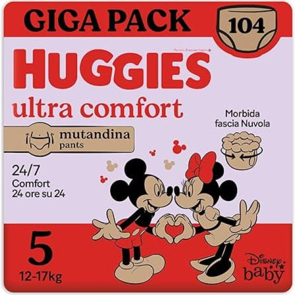 Breathable nappies size 5 for babies and toddlers from crawling age with a weight of 12 to 17 kg; protection and comfort; ideal pack for 1 month use Nappies with unique absorbency; liquid absorption in seconds for lasting dry skin; colour-changing wetness indicator as an indication for nappy changing All-round fit: nappy panties with a feel almost like underwear; elastic leg cuffs and extra soft waist cuffs for more comfort and perfect hold without cutting into the sensitive stomach Easy to put on and take off; tear-open sides and tape for easy disposal; perfume-free and free from natural rubber latex Box contents: Huggies Ultra Comfort Pants size 5; storage pack; 2 x 52 pieces = 104 nappy pants in total; monthly pack, size pack › See more product details; Product description Super absorbent size 5 nappies for active babies and toddlers weighing 12 to 17 kg; protection and comfort, ideal monthly box - unique absorbency; fluid absorption in seconds for lasting dry skin, colour-changing wetness indicator as an indication for nappy changing; all-round fit: feels like underwear, easy to put on and take off; elastic leg cuffs and full waist cuffs for more comfort and perfect hold without cutting in sensitive sensitive stomach sensitive stomach sensitive stomach Waistband technology for extra gentle wearing comfort - tear-open sides and tape for easy disposal; perfume-free and free from natural rubber latex; Product description Super absorbent size 5 nappies for active babies and toddlers weighing 12 to 17 kg; protection and comfort, ideal monthly box - unique absorbency; fluid absorption in seconds for lasting dry skin, colour-changing wetness indicator as an indication for nappy changing; all-round fit: feels like underwear, easy to put on and take off; elastic leg cuffs and full waist cuffs for more comfort and perfect hold without cutting in sensitive sensitive stomach sensitive stomach sensitive stomach Waistband technology for extra gentle wearing comfort - tear-open sides and tape for easy disposal; perfume-free and free from natural rubber latex; Super absorbent size 5 nappies for active babies and toddlers weighing 12 to 17 kg; protection and comfort, ideal monthly box - unique absorbency; fluid absorption in seconds for lasting dry skin, colour-changing wetness indicator as an indication for nappy changing; all-round fit: feels like underwear, easy to put on and take off; elastic leg cuffs and full waist cuffs for more comfort and perfect hold without cutting in sensitive sensitive stomach sensitive stomach sensitive stomach Waistband technology for extra gentle wearing comfort - tear-open sides and tape for easy disposal; perfume-free and free from natural rubber latex