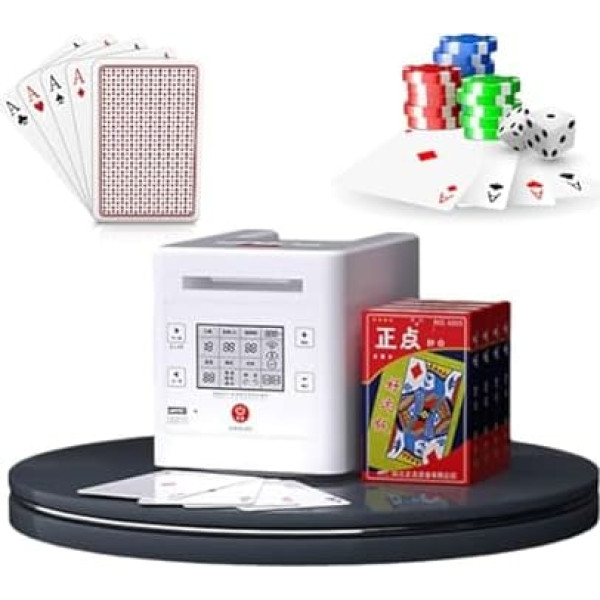 Activate the random function and let our automatic card dealer take care of shuffling and cutting cards. The system ensures an even distribution of cards to any position, eliminating manual shuffling. Enjoy a hassle-free gaming experience with this convenient feature. Flexible rotating card trading: Our card dealing machine supports 360°, 90° and 180° rotation for exchanging cards. Customize the dealing process to your preferences and game requirements. Ideal for different group sizes: The OLED screen on our card dealer allows easy adjustment of the settings. Set the number of players (1-12), community cards (1-199), dealt cards (1-199) and dealt multiple cards at the same time (1-199). The card slot can hold up to 4 decks of cards and is compatible with different card types. Inductive pause function: pause the card dealing process effortlessly by touching the top of the device. Continue the game from the beginning with a press of the [Start] button. This feature adds comfort and flexibility to your gameplay. 【Adjustable Card Dealing Distance】: Adjust the distance to the card trade based on your table size. Our card dealer allows you to control the strength and size of the card output, ensuring cards stay within the limits and allow for a seamless gaming experience. › See more product details; Product description Smart card dealer, 360 degree rotation, no cheating in the game, supports the number of cards from 4 decks to be dealt. It can be adjusted at will for 1-12 people, and the operation is simple and flexible. Technical data: Product name: automatic poker trading machine. Colour: white. Material: ABS plastic. Battery capacity: 2000 mAh. Product size: 149 x 107 x 123 mm. Weight: 1000g Package includes: 1 x automatic card dealer; Product description Smart card dealer, 360 degree rotation, no cheating in the game, supports the number of cards from 4 decks to be dealt. It can be adjusted at will for 1-12 people, and the operation is simple and flexible. Technical data: Product name: automatic poker trading machine. Colour: white. Material: ABS plastic. Battery capacity: 2000 mAh. Product size: 149 x 107 x 123 mm. Weight: 1000g Package includes: 1 x automatic card dealer; Smart card dealer, 360 degree rotation, no cheating in the game, supports the number of cards from 4 decks to be dealt. It can be adjusted at will for 1-12 people, and the operation is simple and flexible. Technical data: Product name: automatic poker trading machine. Colour: white. Material: ABS plastic. Battery capacity: 2000 mAh. Product size: 149 x 107 x 123 mm. Weight: 1000g Package includes: 1 x automatic card dealer