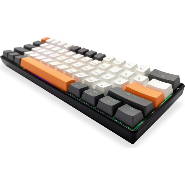 Compact Design: 60% layout with 61 keys saves desk space while maintaining functionality. Ideal for users seeking efficiency and elegance.   Enhanced Multimedia Functions: 6 multimedia shortcuts accessible via the FN key. Improves productivity and convenience.   Customizable Illumination: 19 colorful lighting modes to personalize your gaming experience. Adjustable to suit your style and mood.   Gaming Precision: 25-key anti-ghosting ensures accurate, error-free gameplay. Offers precise control for competitive advantage.   Ergonomic Design: Three adjustable angles for hand support. Enhances comfort during extended gaming sessions.   Reliable Connectivity: USB-C port for stable and fast connections. 160 cm cable for flexibility and desk organization.   Broad Compatibility: Works with Windows (8, 10, 11) and Mac OS. Ensures seamless operation across platforms.