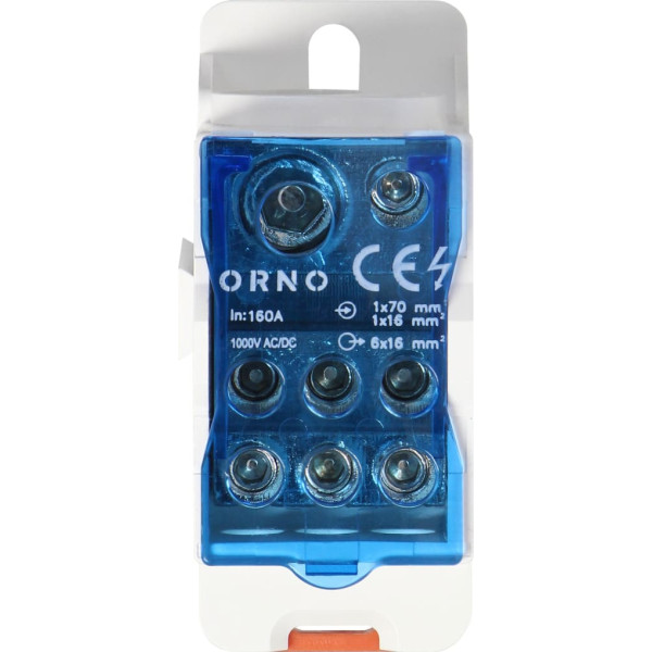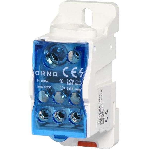 Pārslēgšanas bloks 160A, ieejas spaile 1x16 un 1x70mm2, izejas spailes 6x16mm2, ērta montāža uz DIN sliedes.
