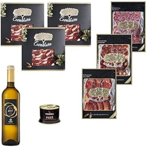 // CONTENTS: This gourmet basket contains: 3 on Pata Negra Iberian ham from Guijuelo 100 gr, 1 on Pata Negra Iberian ham from Guijuelo 100 gr, 1 on Extra Ibérico Chorizo by Pata Negra. from ast Guijuelo 100 g, 1 bag of Iberian salchichón from acorn fattened Pata Negra de Guijuelo 100 g, 1 bottle of organic Verdejo wine \; Product description This assortment includes: 3 packets of Pata Negra Red Label from Guijuelo with acorn fattening, 100 g. 1 Envelope Pata Negra de Guijuelo Iberico de Bellota Salchichón – 100 g 1 bottle of Verdejo \; Product description This assortment includes: 3 packets of Pata Negra Red Label from Guijuelo with acorn fattening, 100 g. 1 Envelope Pata Negra de Guijuelo Iberico de Bellota Salchichón – 100 g 1 bottle of Verdejo \; This assortment includes: 3 packets of Pata Negra Red Label from Guijuelo with acorn fattening, 100 g. 1 Envelope Pata Negra de Guijuelo Iberico de Bellota Salchichón – 100 g 1 bottle of Verdejo \