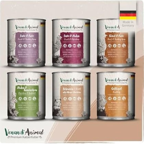 Tasting package: with 6 selected varieties - suitable for all ages. Grain-free, natural cat food with extra high meat content. Our mission: natural, genuine, original - this is Venandi. ❗️ This is important to us: natural ingredients - real raw materials - original compositions. Quality promise: Venandi Animal is made in Germany. We only use meat in 100% premium quality. › See more product details