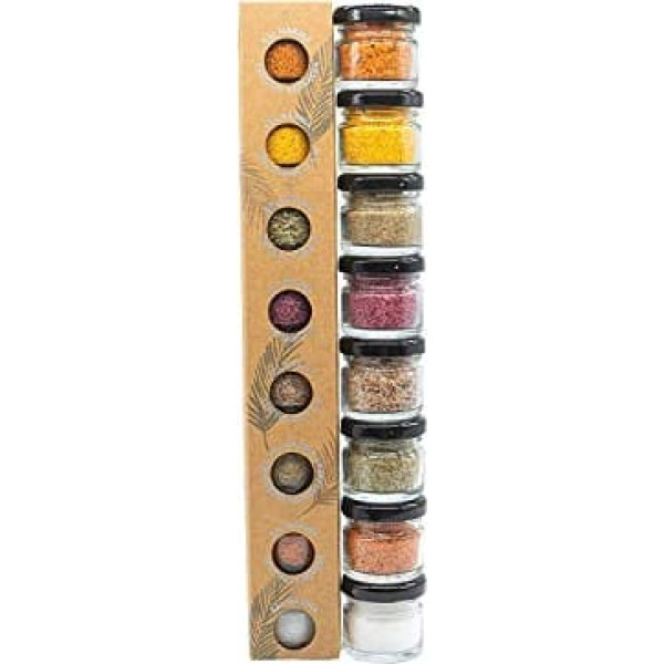Now also available as a black edition with the ASIN B093Q92YRW 8 salt compositions for gourmets: ideal gourmet tasting set for cooking. Our salt flakes are perfect for refining any meal. This fantastic table salt set consists of 8 x 25 g resealable glasses. The packaging dimensions are 4.6 x 4.6 x 33 cm