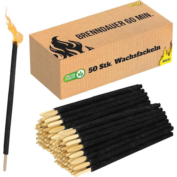 Nico Feuerwerk® Pack of 50 Wax Torches, Burning Time 60 Minutes I High-Quality Wax Torches with Hand Guard for Adults & Children I Garden Torch for Outdoor Party, Event, Night Hiking