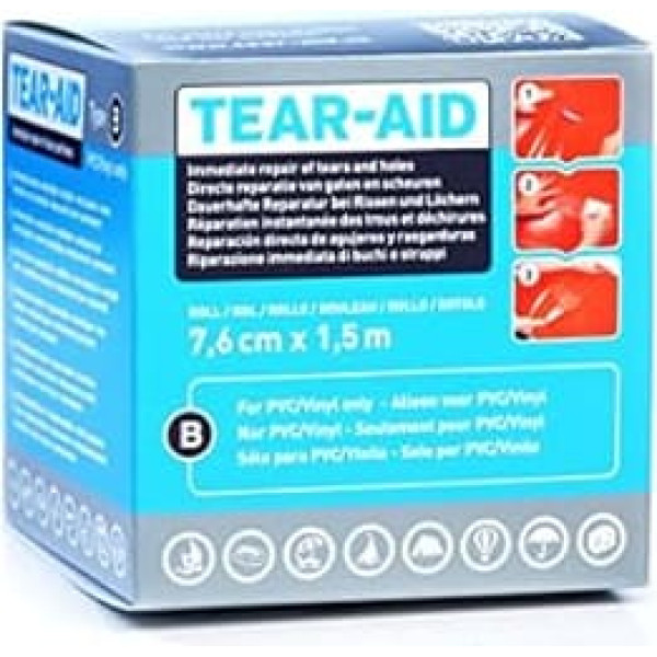 Einzigartiges, transparentes Reparaturmittel für die sofortige Reparatur von Rissen und Löchern in und auf fast allen Materialien Ungewöhnlich stark und elastisch, wind- und wasserdicht sowie sehr dauerhaft Die defekte Stelle reinigen, trocknen, Tear-Aid zuschneiden und aufkleben - fertig 1 Rolle Reparaturmaterial, transparent, 150 x 7,6 cm, 6 x Alkoholtücher zur Vorreinigung und Anleitung Klebt nur auf Vinyl / PVC! › See more product details; Product description Einzigartiges, transparentes Reparaturmittel für die sofortige Reparatur von Rissen und Löchern in und auf fast allen Materialien. Ungewöhnlich stark und elastisch, wind- und wasserdicht sowie sehr dauerhaft. Die defekte Stelle reinigen, trocknen, Tear-Aid zuschneiden und aufkleben - fertig! Typ A klebt nicht auf Vinyl / PVC! Typ B ist nur für Vinyl/PVC-Material. Gehört in jede Camping-, Outdoor- und Sportausrüstung und ist unglaublich universell nutzbar.; Product description Einzigartiges, transparentes Reparaturmittel für die sofortige Reparatur von Rissen und Löchern in und auf fast allen Materialien. Ungewöhnlich stark und elastisch, wind- und wasserdicht sowie sehr dauerhaft. Die defekte Stelle reinigen, trocknen, Tear-Aid zuschneiden und aufkleben - fertig! Typ A klebt nicht auf Vinyl / PVC! Typ B ist nur für Vinyl/PVC-Material. Gehört in jede Camping-, Outdoor- und Sportausrüstung und ist unglaublich universell nutzbar.; Einzigartiges, transparentes Reparaturmittel für die sofortige Reparatur von Rissen und Löchern in und auf fast allen Materialien. Ungewöhnlich stark und elastisch, wind- und wasserdicht sowie sehr dauerhaft. Die defekte Stelle reinigen, trocknen, Tear-Aid zuschneiden und aufkleben - fertig! Typ A klebt nicht auf Vinyl / PVC! Typ B ist nur für Vinyl/PVC-Material. Gehört in jede Camping-, Outdoor- und Sportausrüstung und ist unglaublich universell nutzbar.