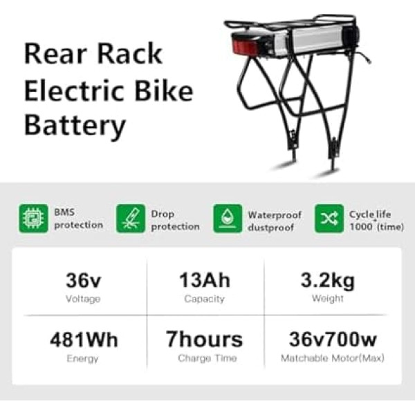 Technical information: this battery is 36 V 13 Ah (JST discharge interface, a positive port red and a negative port black), suitable for 250 W / 350 W / 500 W motor. Max.Current(Continuous):20A. Charger: 42V 2A The battery size is 432 x 156 x 68 mm. Please confirm the battery size before placing an order. High quality cell: top a grade cell, original cell with inkjet code, quality assurance. Smart BMS system, prevents overcharging, over-discharge, over-current and short circuit. Ensure a long service life. Certificate and guarantee: CE, ROHS, UN38.3 certification. All batteries have passed the QC test before leaving the factory. Battery: 18 months warranty. Charger: 12 months warranty. From date of purchase 30 days no reason to return. If the battery has exceeded the warranty period, we continue to provide technical support and purchase of accessories. Ergonomic design: robust aluminium housing, easy to carry and carry. Modern shape design, easy to install and remove. With reflector, use red traffic lights to warn trailing vehicles. Ensure safety when driving at night. The LED power indicator can visually check the battery power. After fully charged, 1 red and 4 green lights are displayed. › See more product details