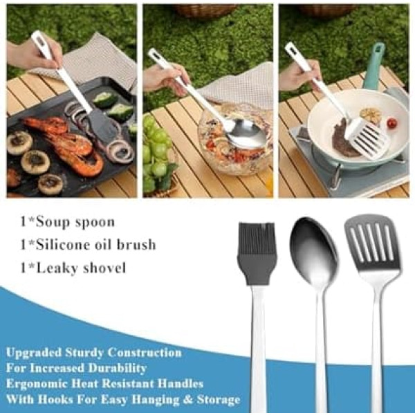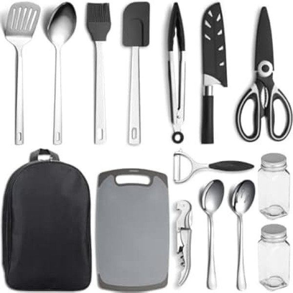 Cost-effective camping kit: this is a complete camping and kitchen set, including oil brush x 1, oil scraper x 1, leaking spatula x 1, tongue spoon x 1, food tongs x 1, kitchen scissors x 1, cooking knife x 1, chopping board x 1, spice bottle x 2, paring knife x 1, bottle opening. ner*1, 1 x community spoon x 1, which can be a good companion for your cooking. Versatile use: this camping set meets all your cooking needs and is perfect for travel, picnics, caravanning, camping, hiking, garden barbecues, parties, concerts, sporting events, boat trips, hiking and more. Stormable and durable: this set is made of high quality stainless steel, which can be used for a long time and will not rust or deform. EASY TO CARRY This camping cookware is lightweight and comes with a special bag to ensure it won't get dirty, scratched or damaged during storage or transportation. The backpack-like storage bag is easily accessible or fits comfortably in your luggage or trunk, and for easy access to your cooking utensils, it is equipped with a secure zip. Easy to clean: this cookware is very easy to clean and can be easily washed by hand or put in the dishwasher. › See more product details; Product description Kyraton Camping cookware set of 15 pieces, stainless steel camping equipment, Ldeal for backpacking, grilling, camping and hiking.; Product description Kyraton Camping cookware set of 15 pieces, stainless steel camping equipment, Ldeal for backpacking, grilling, camping and hiking.; Kyraton Camping cookware set of 15 pieces, stainless steel camping equipment, Ldeal for backpacking, grilling, camping and hiking.