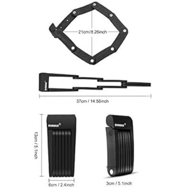 The Dinoka folding locks are made of high-quality steel. As a result, there is a high strength compared to bolt cutters, saws, etc. The C-level lock cylinder core ensures even more safety. Compact folding design. Folding lock with 8 x 360 degree swivel joints which can be easily folded, easy to carry and takes up little space. The folded size is: 13 x 6 x 3 cm. Versatile This lock is ideal for securing bikes, scooters, skateboards, fences, barbecues, lawnmowers, sports equipment etc. Easy-install bicycle lock bracket: The bicycle lock holder with adjustable diameter fits on various sizes of tubes and is easy to adjust. The small size ensures that the bicycle lock can be attached to the bicycle pole in a simple, stable and fall-proof manner. The bicycle lock comes with 2 x pure copper keys. › See more product details; Product description The Dinoka folding bike lock is flexible and offers you more options if you are looking for a place to lock your bike. It is lighter and easier to use. It is easier to unlock, easier to unfold, easier to get around your bike and comes with a better frame mount. Material: Alloy steel. Weight: 700 g. Folded size: 13 x 6 x 3 cm / 5.1 x 2.4 x 1.2 cm. Large size: 70 cm. Inner diameter: 21 cm. Package contents: 1 x Black Folding Bike Lock 1 x holder. 4 x metal screws. 2 x plastic straps. 2 x keys.; Product description The Dinoka folding bike lock is flexible and offers you more options if you are looking for a place to lock your bike. It is lighter and easier to use. It is easier to unlock, easier to unfold, easier to get around your bike and comes with a better frame mount. Material: Alloy steel. Weight: 700 g. Folded size: 13 x 6 x 3 cm / 5.1 x 2.4 x 1.2 cm. Large size: 70 cm. Inner diameter: 21 cm. Package contents: 1 x Black Folding Bike Lock 1 x holder. 4 x metal screws. 2 x plastic straps. 2 x keys.; The Dinoka folding bike lock is flexible and offers you more options if you are looking for a place to lock your bike. It is lighter and easier to use. It is easier to unlock, easier to unfold, easier to get around your bike and comes with a better frame mount. Material: Alloy steel. Weight: 700 g. Folded size: 13 x 6 x 3 cm / 5.1 x 2.4 x 1.2 cm. Large size: 70 cm. Inner diameter: 21 cm. Package contents: 1 x Black Folding Bike Lock 1 x holder. 4 x metal screws. 2 x plastic straps. 2 x keys.
