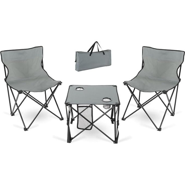 2 folding camping chairs for on the go, folding table with cup holder and side pocket Additional side pocket on the table, practical carry bag included Chair dimensions when assembled (WxHxD): 47 x 47 x 72 cm, seat height: 40 cm Dimensions of the table when assembled (WxHxD): 48 x 48 x 40 cm, side pocket: 12 x 24 cm Cup holder (diameter x depth): 7 x 11 cm, pack size: 72 x 26 x 9 cm, total weight: 4.6 kg, colour: grey, fabric: 600D polyester, maximum permissible load per chair: max. 90 kg › See more product details