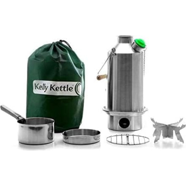 BOIL WATER ULTRA-FAST in the outdoors and cook at the same time, with the famous Kelly Kettle - full kit. A full kit Includes – Kettle + Cook Set + Pot Support. Use the stainless steel pot support to cook over the chimney top as the kettle boils, or use the fire-base of the Kettle as a simple Wood CAMPING STOVE. The Kelly Kettle system is one of the most useful pieces of camping equipment that any outdoors person can own! NO Batteries, NO Gas - FREE FUEL! Using only a handful of fuel such as sticks, Pine cones, Birch bark, dry grass, etc. .....even dry animal dung! The kettle will boil in just 3 - 5 minutes. Enjoy hot water for tea, coffee, rehydrating food, bathing, cooking, etc.....irrespective of weather conditions or your location. Just look at our Pictures! Boil water & cook at the same time when fishing & hunting, Car Camping, trekking, backpacking, Scouts, power cuts, working in the outdoors or simply having a fun family picnic. Order yours today. This Stainless Steel ‘Base Camp’ is the traditional size kettle used by Irish Fishermen. Boils approx. 5 large cups of water at a time. Fire-base and drawstring carry bag are included as standard. Diameter: 18.7cm Height: 34cm (Packed) Weight of full kit: 1.62kg Kettle Capacity: 1.5ltr Pot Capacity: 0.85ltr (Stainless steel Cook set includes a Pot, Pan/lid, 2 no. Grill pieces, Gripper handle.... all pack inside the kettle for compact storage & easy transport) Kelly Kettles are available in various sizes in Stainless Steel or Aluminium. Add our various high quality accessories to complete the Kelly Kettle camping range. No open fire (the fire is contained within the kettle & fire base)! Carbon neutral green camping. No travel restrictions (planes etc.) Extremely popular camping equipment for Wilderness Survival, Emergency Preparedness or Disaster Kit. Lightweight, compact and durable, the Kelly Kettle works in extreme storm or hurricane conditions. 2yr anti-leak warranty with excellent customer service. Kelly Kettle & Volcano Kettle are Registered Trademarks of the Kelly Kettle Co., Ireland › See more product details; Product description This is an extremely efficient Camping Kit which is suitable for Fishermen, family picnics, Car Camping, Scouts, Kayakers, wilderness / Disaster / Earthquake or Survival kit, Caravaning camping gear or for anyone who enjoys the outdoors. This kit includes a strong 1.6ltr Stainless Steel Kettle including Steel fire base, Stainless Steel cook set (small pot, pan/lid, 2 no. grill pieces & gripper handle) & Steel Pot Support all of which fit neatly within the kettle itself for transport or storage. A useful drawstring carrying bag is supplied with each kit. Cost-FREE to run! Never worry about running out of fuel again. Simply gather deadwood, twigs, dry grass, pine cones or whatever natural fuel you find lying around in the area and you can bring 6 cups of water to the boil within a matter of minutes while at the same time (and using the same fuel) cook small amounts of food over the chimney (using the pot on the support) as the kettle boils. Hence, a very small amount of fuel will both boil your water for hot drinks, washing up, personal hygiene, etc. and cook your meal at the same time! This kit works in ALL weather conditions. Note: The Pot-Support & Cook set are suitable for cooking quick cooking items such as soup, boil-in-the-bag, hydrating food, noodles, rice, etc. For more details on how best to use the Pot-Support and Cook set, please go to the FAQ page on our website www.kellykettle.com If more water is required simply refill the kettle with water and place it back on the fire-base. Refuel the chimney again and your kettle will boil again within approx. 3-5 minutes.; Product description This is an extremely efficient Camping Kit which is suitable for Fishermen, family picnics, Car Camping, Scouts, Kayakers, wilderness / Disaster / Earthquake or Survival kit, Caravaning camping gear or for anyone who enjoys the outdoors. This kit includes a strong 1.6ltr Stainless Steel Kettle including Steel fire base, Stainless Steel cook set (small pot, pan/lid, 2 no. grill pieces & gripper handle) & Steel Pot Support all of which fit neatly within the kettle itself for transport or storage. A useful drawstring carrying bag is supplied with each kit. Cost-FREE to run! Never worry about running out of fuel again. Simply gather deadwood, twigs, dry grass, pine cones or whatever natural fuel you find lying around in the area and you can bring 6 cups of water to the boil within a matter of minutes while at the same time (and using the same fuel) cook small amounts of food over the chimney (using the pot on the support) as the kettle boils. Hence, a very small amount of fuel will both boil your water for hot drinks, washing up, personal hygiene, etc. and cook your meal at the same time! This kit works in ALL weather conditions. Note: The Pot-Support & Cook set are suitable for cooking quick cooking items such as soup, boil-in-the-bag, hydrating food, noodles, rice, etc. For more details on how best to use the Pot-Support and Cook set, please go to the FAQ page on our website www.kellykettle.com If more water is required simply refill the kettle with water and place it back on the fire-base. Refuel the chimney again and your kettle will boil again within approx. 3-5 minutes.; This is an extremely efficient Camping Kit which is suitable for Fishermen, family picnics, Car Camping, Scouts, Kayakers, wilderness / Disaster / Earthquake or Survival kit, Caravaning camping gear or for anyone who enjoys the outdoors. This kit includes a strong 1.6ltr Stainless Steel Kettle including Steel fire base, Stainless Steel cook set (small pot, pan/lid, 2 no. grill pieces & gripper handle) & Steel Pot Support all of which fit neatly within the kettle itself for transport or storage. A useful drawstring carrying bag is supplied with each kit. Cost-FREE to run! Never worry about running out of fuel again. Simply gather deadwood, t