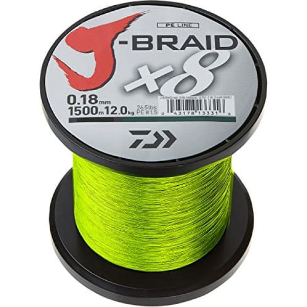 8-times braided fishing line Length: 1500m Diameter: 0,22 mm Capacity: 17,0kg/27,5lbs Colour: chartreuse › See more product details; Product description Daiwa J-BRAID X8 - Round braided line - The new J-Braid from DAIWA is an exceptional fishing line, which is braided of 8 single strands and completely fulfills all requirements expected of a high-quality fishing line. Regardless if you want to fish for the large saltwater predators like halibut, cod and coalfish or aim to target perch or zander – with the new J-Braid you always ensure the proper contact to the fish. The J-Braid offers the matching diameter for every fishing technique, regardless if sea, river or lake – uncompromising strong and reliable. The J-Braid glides through the guides smoothly and silently, enabling long distances also with lightweight lures. Perfect for spinning and baitcasting reels! Unbelievable price-performance ratio! 8 strand braid, Roundly braided, High linear strength, High abrasion resistance, No stretch, Made in Japan; Product description Daiwa J-BRAID X8 - Round braided line - The new J-Braid from DAIWA is an exceptional fishing line, which is braided of 8 single strands and completely fulfills all requirements expected of a high-quality fishing line. Regardless if you want to fish for the large saltwater predators like halibut, cod and coalfish or aim to target perch or zander – with the new J-Braid you always ensure the proper contact to the fish. The J-Braid offers the matching diameter for every fishing technique, regardless if sea, river or lake – uncompromising strong and reliable. The J-Braid glides through the guides smoothly and silently, enabling long distances also with lightweight lures. Perfect for spinning and baitcasting reels! Unbelievable price-performance ratio! 8 strand braid, Roundly braided, High linear strength, High abrasion resistance, No stretch, Made in Japan; Daiwa J-BRAID X8 - Round braided line - The new J-Braid from DAIWA is an exceptional fishing line, which is braided of 8 single strands and completely fulfills all requirements expected of a high-quality fishing line. Regardless if you want to fish for the large saltwater predators like halibut, cod and coalfish or aim to target perch or zander – with the new J-Braid you always ensure the proper contact to the fish. The J-Braid offers the matching diameter for every fishing technique, regardless if sea, river or lake – uncompromising strong and reliable. The J-Braid glides through the guides smoothly and silently, enabling long distances also with lightweight lures. Perfect for spinning and baitcasting reels! Unbelievable price-performance ratio! 8 strand braid, Roundly braided, High linear strength, High abrasion resistance, No stretch, Made in Japan