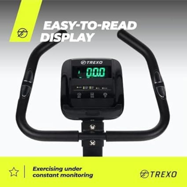 High quality: the fitness equipment has been developed with a long time in mind, so only high-quality materials have been used in the production of the exercise bike. The device weighs 21 kg, which in combination with the robust construction ensures stability and safe training. The wide feet also contribute to a good grip on the floor. The levelling system allows you to adjust the exercise bike to stand securely on the floor. Magnetic resistance system: this resistance system has movable magnets attached near the 4 kg flywheel, with which you can control the intensity of your training via a regulator. The main advantage of the magnetic resistance system is its smoothness and precision. The resistance can be easily adjusted to suit individual needs, allowing you to perform a variety of training programs and develop your muscle strength. Comfortable pedals: safety and comfort are among the most important advantages of this exercise bike. The comfortable pedals are equipped with clip-on straps. They attach easily to your shoes and provide stable and secure grip. This also increases the intensity with which you can pedal. PERFECT FOR THE LIVING ROOM: The TREXO Hex is a compact model with the dimensions 1050 × 510 × 1220 mm, so that it can be stored even in a small room. The quiet operation of the device allows you to focus on your training. Other household members are not disturbed either. All this together makes it the ideal fitness equipment for the home. For everyone: with a maximum weight capacity of up to 110 kg, the stationary bike can be used successfully by people of all ages and fitness levels. It is an excellent device for cardio and circuit training and also helps with rehabilitation. Depending on the level of training, you can create your own individual training plan, and the other family members will certainly enjoy using the device. › See more product details